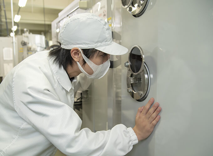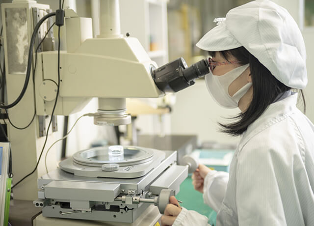 私の所属する部署では、レンズのコーティングを行っています。反射防止膜やアルミコーティングを行う事によって、様々な光の特性(反射率、徳化率)をレンズに持たせています。その中で主に生産技術を担当しており、お客様から依頼された図面や仕様書を基に、規格値の設定やコーティングの設計などを検討し、提案をしています、更に製造工程を量産へ落とし込む業務を行っています。
