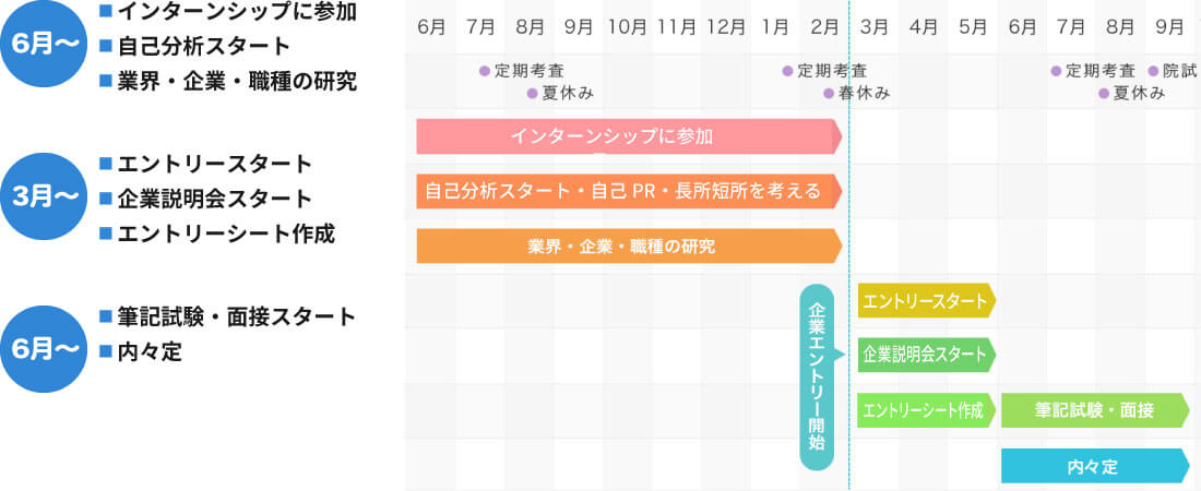 基本的に2021年卒の採用選考から変更なく、3月から採用情報の解禁・会社説明会受け付け開始、6月から面接や選考が解禁となります。また、大学3年生向けのインターンシップは、通常通りならば2020年夏から開催されます。一方、新型コロナウイルスの影響で、1つ前の世代でも企業が計画通り採用できなかったり、説明会・面接が滞ったりしています。その為、採用手法や時期が多様化し、独自のスケジュールで選考を進める企業も増えてきました。例年以上に、各企業から発信される情報を正しくつかんで、行きたい業界、企業の情報収集を広く集めていくことが大事です。